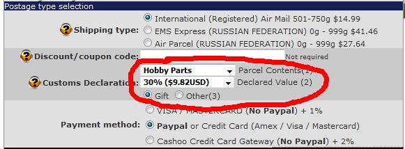 на выбор аж 3 варианта - Цитата: 1) Order via EMS Express, UPS, DPD, Air Mail or DHL if available. 2) Reduce total battery capacity to under 4500mAh. 3) Order from Hobbyking.com DE, US or AU warehouse if available.