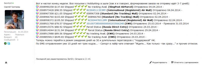 Вот и настал конец недели. Все посылки с HobbyKing-а ушли (как я и говорил, формирование заказа на отправку идёт 3-7 дней):