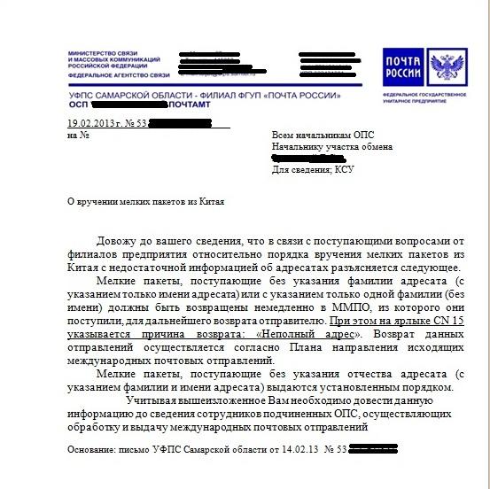 Читайте заново. Конечно пропустили! Пост 78. В письме нет упоминания отчества! Это самодеятельность почтовых работников. Более того, на сегодняшний день, действие письма приостановлено. Пост 101. Я не могу сослаться на номер письма. В каждой области РФ он разный.