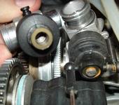 Это типичный 3-х игольчатый ползунковый карбюратор. Главная игла (1) находится выше и слева, игла низких оборотов (2) закручена справа, третья “игла” (3) в действительности является регулируемым топливным впуском. Регулировка иглы низких оборотов и топливного впуска одновременно влияет на то, когда кончик топливного впуска выставляется на прямой поток воздуха и слегка увеличивается поток топлива. Отметьте, что топливный впуск выставлен на полный поток при 1/3 газа.