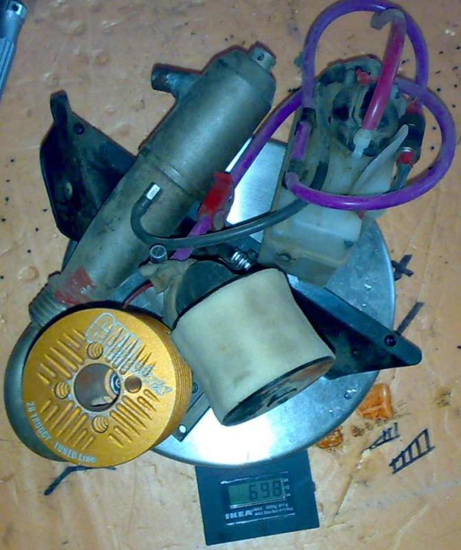 Двигатель с трубой, топливный бак и защитная лыжа. Вместе весят 700 грамм и это без топлива. Оно добавит ещё 150 грамм.