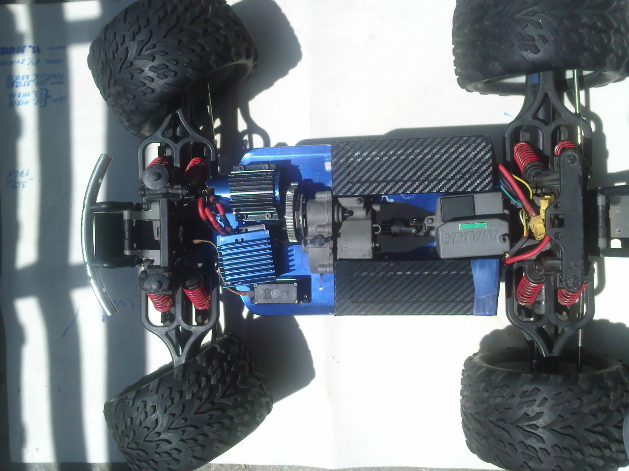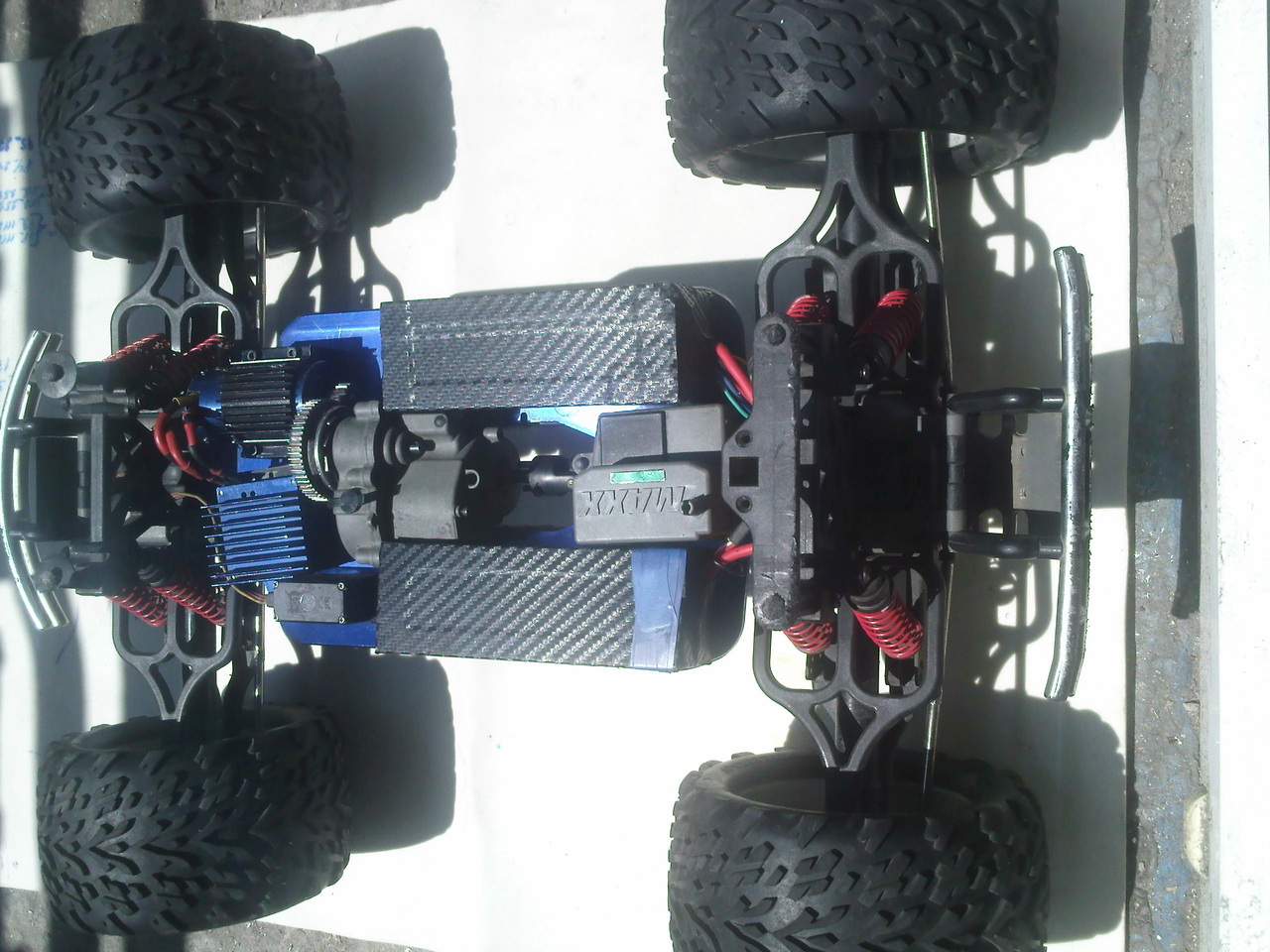 Достался по случау в жирном обвесе. Подвеска низ крепления кузова рпм , стальные карданы и мечта со времен ревы - труба с двойным выхлопом. В отличии от ревы понравилась доступность двигла. Хотя имея опыт общения с trx очень его побаиваюсь особенно карб. Решил весь тюн кроме трубы продать и катать на стоке. Мерял температуру телеметрией спектрум и показывало до 130 при езде и 85 на холостых. Что то пугает такая температура. Датчик стот гдето на 3 редре вверх от мотора.