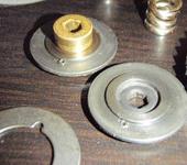вот та шайба которая стоит за пружиной должна вращяться вместе с валом, вал должен быть за резьбой-шестигранным и шайба, точнее две за шестерней такаеже, плотно на валу с шестигранником сидит и зажимают эту шестерню с обоих сторон пружинкой, просто на шестерёнке нехватает накладки металической, когда отвернёш то поймёш…