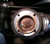 Общий пробег двигателя вместе с обкаткой - чуть больше галлона. В эту покатушку он честно скушал 3 бака топлива Mecamo 25%, температура была около 100-110 градусов. При приземлении после трамплина трага неестественно переворачивается, двигатель взвыл до максимальных оборотов сек. на 5, после чего заглох. Сняв корпус было обнаружено подергивание сервы газа на середине ее хода (думаю от крошек металла, пролетевших в заслонку и подклинивших ее). Вскрытие показало: