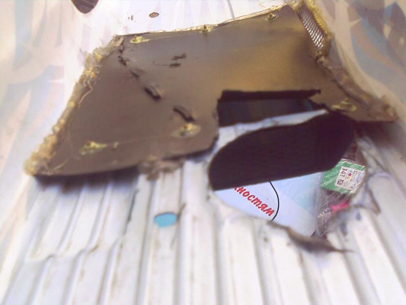 Немного не в тему.Прыгал и попал защитой спура на камень, в результате шестерня продрала дырку и защита лопнула в районе второго винта (внизу).