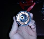 Но на этом проблемы не закончились. Кольца держащие магнит, хоть и отстранились от него, дальше слезать не хотели. Снова тиски, кувалда, выколотка. В процессе слегка повредился уже и магнит (фото 3 и 6) (кожух движка и крышки уже были все серьезно покоцаны, 2 отверстия пришли в полную негодность (фото 4,5)