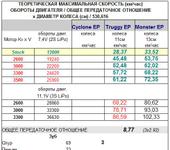 Не вникал в твои цифры, я считал отсюда брав формулы, отсюда и родилась предыдущая таблица, единственное я не знал кол-во зубов на дифе и соответственно брал общее передаточное отношение с интернета, а там по одним данным это 7.5 а по другим 8.8. Сейчас не поленился и разобрал диф, посчитал зубья и пришел к выводу, что 8.8 больше на правду похоже. Вот пересчитал и получилась еще одна таблица. Кстати с того же интернета я долго искал и нашел, что обороты двигателя стокового 27Т равны 12000 но никак не 7572,32. Где то у тебя не пляшет. (кстати а какой диаметр у багийных колес?, по твоим данным 8.4см - это точно? тоже засуну в расчеты)
