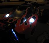Привет. Я использовал 4 светодиода на 25кд 5mm. Они держат 3v. Для питания использую блок с 2-мя пальчиковыми батарейками. Спереди окантовка сделана из обрезки шариковой ручки, отражатель - фольга, она проложена изнутри, чтобы корпус не светился. Снаружи использовал изоленту для изоляции. Сзади диод помещен в красный колпачек от ручки. Светит тоже ярко. Внутри провода проложены через трубочки для питься, в них 5mm диоды очень хорошо входят. Вот так. Тачила пережила уже пять катаний в снегу. Все живо. Если что спрашивайте