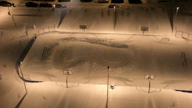 Вот как можно сделать трассу, просто хоккейная коробка во дворе,зимой хоккеисты пару раз прощелкали и всю её замело - всё,до весны она наша, потом футболисты придут. Лопату в руки и за 3-4 часа трасса готова. На фото половина только, потом продолжили её до правых ворот полностью. Ниче сложного а удовольствия достаточно :