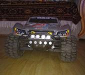 Колеса остались от stampede, заменить пришлось корыто, центральный кардан, держатель батареи и передний бампер. эти детали от слэша. а чтобы колеса не цепляли за кузов, я приподнял стойки на 20 мм.