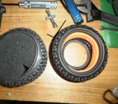 Далее немного доработок “на коленке”, как советуют из-за бугра (вычитано на питерском сайте в теме об этой модели): срезаем ребро по центру диска, для установки более жесткой вставки внутрь покрышки (в комплекте прилагались 2 варианта вставок - жесткие оранжевые и мягкие серые, для трассы выбираем первые).