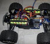 С расположением источников питания и регулятора, вначале были проблемы, но потом удалось найти решение более-менее оптимальное (тестирование покажет, пока идет посторойка). Для батарей пришлось пристраивать 2-ой этаж, так в центре вс1 в движении (амортизаторы, тяги и т.д), путем установки 6-ти стоек и полки с вырезами для доступа к насторйкам. Первые 4 стоики прикручены к винтам крепления серв рулевого управления, 1 к удлиненному винту крепления корпуса приемника и один на задней стойке крепления кузова. С размещением батарей придется по-играть,чтобы не испортить развесовку.