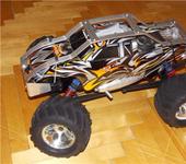 После того, как родной кузов был измочален в процессе нереального отрыва в хлам (штатные кузова Kyosho славятся своей хрупкостью), был приобретен новый, от TRAXXAS Revо, который был немного доработан с помощью молотка, напильника и такой-то матери (шутка))), так что теперь мы выглядим так