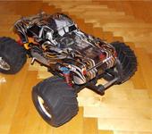 После того, как родной кузов был измочален в процессе нереального отрыва в хлам (штатные кузова Kyosho славятся своей хрупкостью), был приобретен новый, от TRAXXAS Revо, который был немного доработан с помощью молотка, напильника и такой-то матери (шутка))), так что теперь мы выглядим так