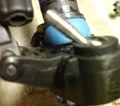 В общем надумал я продлить жизнь амортизаторам, надев на них пыльники. В качестве пыльников использовал обычные напальчники, почистил амортизатор, надел на него напальчник, внутырь напшикал силиконовой смазки, и стянул все это стяжками.