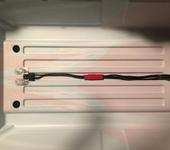После чего вставляем заклепки в просверленные отверстия (входят достаточно туго) и закрепляем провод на держателе. Далее отрезаем с запасом от тройника провод, идущий на люстру, и оставшуюся часть припаиваем к свободному концу провода от контактов. Ставим держатель на место, подключаем провода и помечаем на стойке + и -. Вот что у меня получилось.