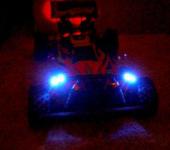 Схема - пустяковая, передние СИД подключены параллельно каждый с одним резистором на все (75 ом), TLCB 5800, голубые, 2,5 канделл. Задние - попарно-параллельно, с резисторами на 150 ом, красные, L-1503SRC-F, 4 канделл. Питание сделал от батарейного отсека на 4 банки. Сид обошлись где-то по 25 и 10 руб соответственно + держатели для СИД где-то по 20, отсек около 15, в общем немного. Брал все в платане и митраконе. Потребление - мизерное, где-то около 40 мА, такчто батарей хватит очень надолго.