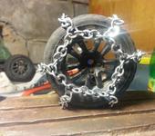За 2 года резина стала лысая и по снегу машинка никуда не ехала, поэтому сделал цепи противоскольжения. У нас городок маленький и готовых цепочек такого размера не найти, поэтому собрал из шайб гровера. Ща по снегу и льду прет как сумашедшая, застревает если только сугроб выше крыши.