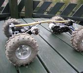 Верхний, между прочим, очень интересный концепт. Для crawler’а. Использована схема безаммортизаторной подвески. Там даже рессоры не предусмотрены. Блок с мотором, коробкой и колёсами вращается вокруг оси рамы на подшипнике. Этим достигается потрясающая артикуляция.
