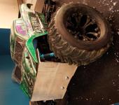 На бампер посадил алюминиевый тавр. Привода целые поставил на заднюю ось. Пара минут езды: врезался в лежащий кирпич уже на торможении, а тормозит задней осью отвратительно - вообще не тормозит и заносит. Сломал шасси. Шасси нигде нет. Буду клеить и делать жёсткий каркас из алюминия.