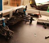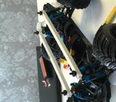 На бампер посадил алюминиевый тавр. Привода целые поставил на заднюю ось. Пара минут езды: врезался в лежащий кирпич уже на торможении, а тормозит задней осью отвратительно - вообще не тормозит и заносит. Сломал шасси. Шасси нигде нет. Буду клеить и делать жёсткий каркас из алюминия.