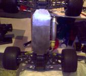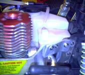 На очередных покатушках на даче улетела пружина крепления выхлопного коллектора к двигателю, она изначально слабая, поставил HPI. Кто когда-нибудь ставил ее на вархед, тот меня поймет, эта операция просто выносит мозг!!!, так как делать нужно только в недрах машинки при каждом демонтаже мотора. После очередного демонтажа мотора, я сделал пропил в раме, доработал крепление маленького бачка (см.фото). Теперь я могу снимать и ставить двигло с машины вместе с выхлопным коллектором – это кайф)).