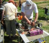 Я продолжал тестировать ДВС-ную багги. В квалификации ехал неплохо, иногда даже удавалось лидировать, но подводил движок - перегревался и глох (я это мог предполагать, особенно по жаркой погоде). Настроен-то он был на короткую трассу X-клуба, а тут она и больше, и кочек полно. Пришлось поменять пару свеч и обогатить мотор в итоге даже чуть больше, чем при обкатке. И в финале договорились дозаправиться на 4-м круге, чтобы топлива хватило наверняка. Как и ожидалось - Мини Инферна, да ещё стадиум - быстрее всех на уличной трассе, что и продемонстрировал Фыкин Алексей. Ну и как обычно, очень тяжело было по кочкам лёгким Ассошкам - им тут сложнее, чем на клубной трассе, это вам не ковёр…