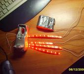 Что необходимо: светодиодная лента 90 сантиметров работает от 12 вольт ( ленты можно меньше, купил в специализировано магазине где много лампочек продают) 8 аккумуляторов (дома валялись вполне рабочие), паяльник, провода, автомобильный скотч, кусок прозрачного пластика (я взял со тарой упаковки наушников), пару пластиковых хомутов.