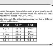 Для этого и других моторов можно пользоваться таблицами любого производителя, просто смотрите рекомендуемую передатку для аналогичного вашему по виткам мотору. При смене ротора скажем на меньший уменьшайте на зуб, на больший повышайте, ну это так, очень условно.