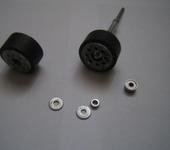 Колеса. Вырезал диски, вырезал кольца из резинового шланга, диски склеил в половинки колесных дисков, шины из резинового шланга стянул этими полвинками дисков