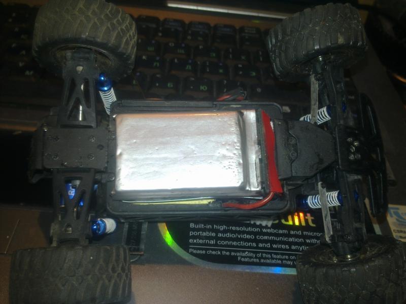 батарея от стрекозы в толщину 14мм. машинка тогда будет брюшко об дорогу чесать…