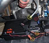 Один бокс я прикрутил на крышку от отсека для аккумулятора (оба бокса посажены на герметик) в нем находятся транспондер выведенный наружу и прикрученный к той же крышке, соединенный Y-кабелем с конденсатором, все это напрямую подключено к оккумулятору (киллер-рсишная липолька имеет 2 разъема что очень удобно), в этом же боксе лежит килсвич с пищалкой и диодом, бокс имеет прозрачную точку на крышке (выделена красным кружком на картинке) так что выводить диод наружу не нужно, килсвич соединен удлинителем с приемником который находится в другом боксе установленном спереди, чтобы снять крышку с бокса аккумулятора надо отсоединить 3 провода: ведущий из бокса к аккумулятору, от килсвича к приемнику и шнур соедениющий свич с двигателем особых трудностей это не представляет.