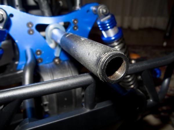 Немного нарастил выхлоп, а то его чуть-чуть не хватало до края бампера, капало бы все на шасси: