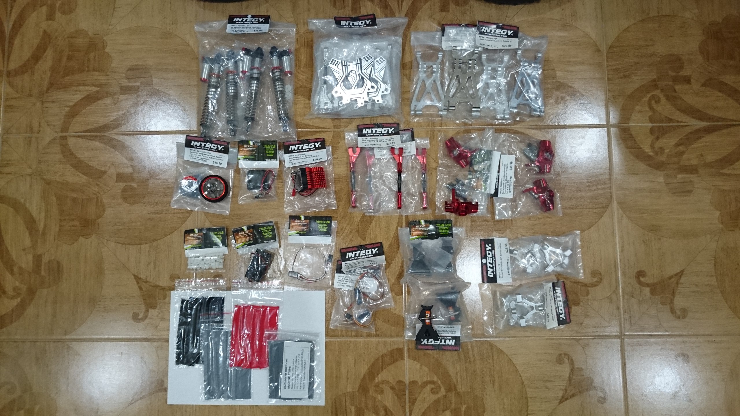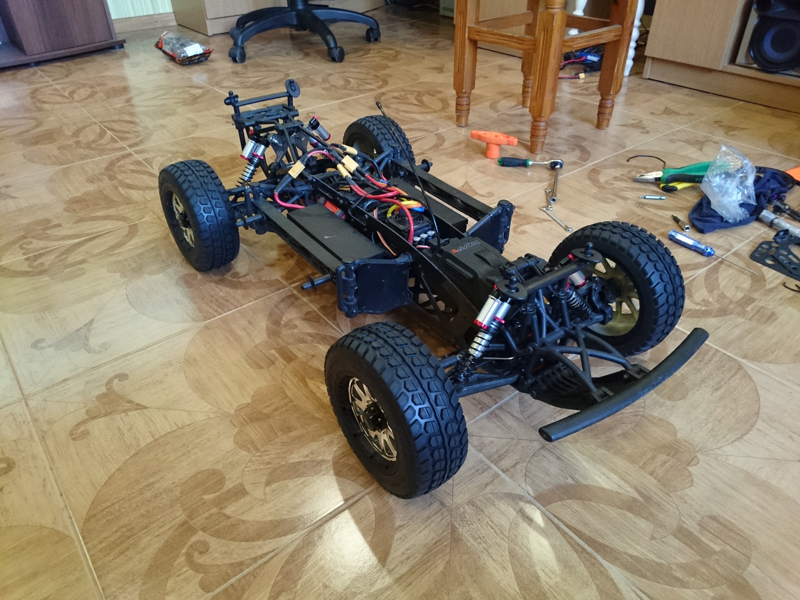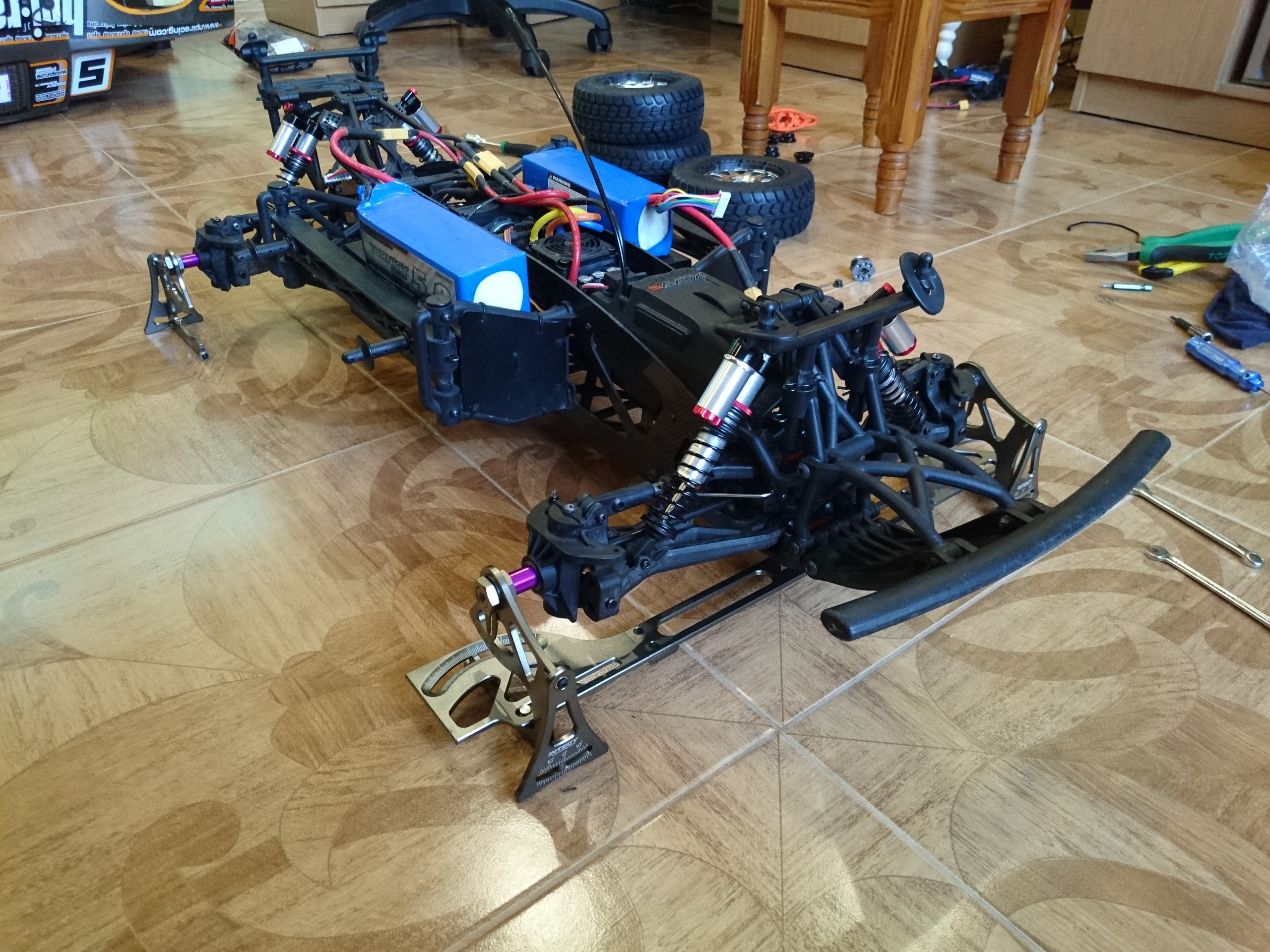 аккумуляторы 2шт. TURNIGY 6S 5000mah 25C, колеса алю взял для эксперимента и резина на них оказывается одна из лучших (протектор выше, сам протектор является копией резины BFgoodrich - одна из лучших фирм для внедорожных колес.) и вылет больше ( база колес шире, а значит модель ещё стабильнее против в опрокидывании в повороте), передние штоки с самой Baja взял, чтоб создать почти “идеальные амортизаторы” - не будут протекать (сочиться) за счет установки специальных сальников исходя из этого амортизаторы не будут часто обслуживаться, а то и с INTEGY как я понял вообще не фонтан по работе, но система PIGGYBACK довольно интересно как работает, фары для каркаса, элемент переднего крепления кузова, пружины самые жесткие.