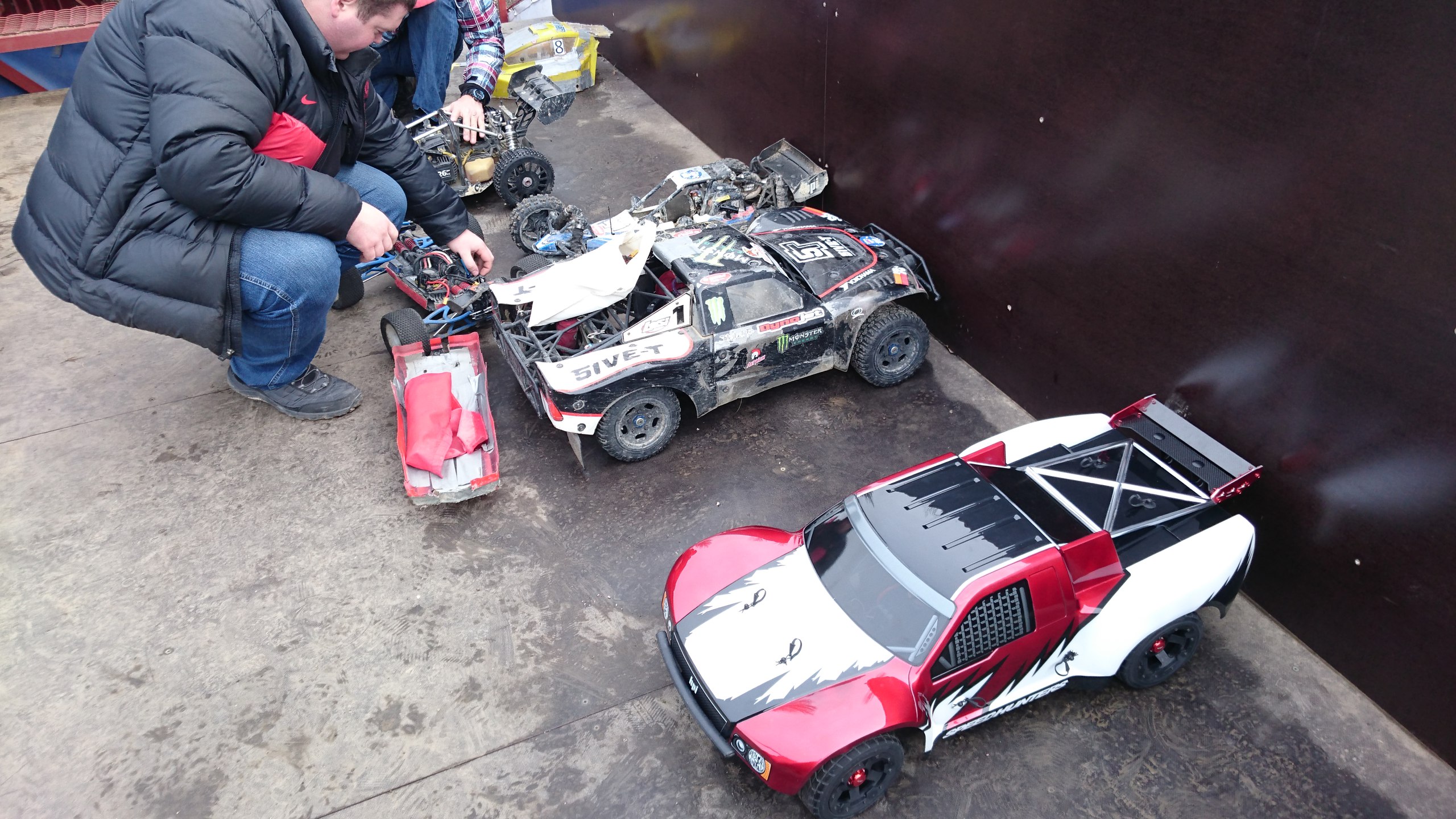 Съездил к Симферопольским моделистам, гоняли на велотреке длинна которой 200метров. Получилось так, что собралось аж 4 пятёрки: моя HPI Super 5SC Flux, HPI Baja 5B, Losi 5T, MCD.