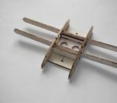 Узел задания поперечного V крыла (и съемного крепления крыла к пилону) собираем на двух V образных бальзовых направляющих последовательно вклеивая на них пакеты центральных нервюр. До склейки контролируем расположение этих пакетов на шипах пилона крепления крыла (для получения легкосъемного соединения) и только поске этого производим их склейку.