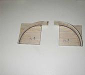 Займемся заделкой задней кромки крыла. На две полоски бальзы клеим малярный скотч, смачиваем их и оборачиваем вокруг цилиндрической поверхности (бутылка). Даем бальзе высохнуть и клеим в торец к бальзовым прямоугольным заготовкам. Прикладываем полученные сегменты к крылу и отмечаем необходимую высоту криволинейных поверхностей с учетом толщины нашего шпона. Обрезаем по разметке и приклеиваем еще парочку прямоугольных заготовок. Приклеиваем полученные сегменты к крылу. Обрезаем с запасом излишки бальзы. Обернув шкуркой трубу доводим профиль задней кромки крыла в месте вклейки сегментов “до кондиции”.