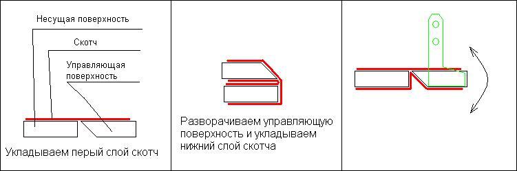 А этот способ, по сравнению с навеской на две полосы скотча (сверху и снизу), имеет преимущества: не отслаивается и совсем не создает сопротивления сервам. Ну и нет необходимости прорезать пазы под петли:)