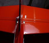 Дальше на фотке видна силиконовая прослойка на месте, куда ложится крыло. Изначально угол атаки крыла был слишком большой: аж +4,5 градуса. Я изменл его до +2, а образовавшуюся щель между фюзеляжем и крылом заполнил жидкой полоской белого силикона. Для этого на крыло в зоне, где будет силикон, временно клеится полоска скотча, чтобы силикон не приклеился к поверхности, затем устанавливается крыло в своё правильное положение, и в щель аккуратно и дозированно выдавливается из тонкого носика балона силикон. Пока он не застыл, излишки убираются палочкой-шпателем.
