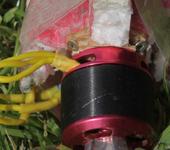 Потом применил ноу-хау, которое неоднократно выручало, попробую объяснить. Закрепил мотор на фанерке для крепления из комплекта. Примерил и просверлил наискосок по углам моторамы отверстия под мелкие саморезы типа 30х2,5. На фанерке надфилем по углам пропилил щели с наклоном так, чтобы вкрученные в мотораму (под углом градусов 40) шурупы шляпками плотно поджимали фанерку. Т.е. получается, что шляпки саморезов (там 45 градусов угол) поджимают фанерку с углов в пропилах (не дают смещатся относительно моторамы) плюс за счет оставшихся 5-и градусов еще и прижимают к плоскости моторамы. При краше (по первому времени - каждый полет 😃 ) мотор с вращающимся пропеллером (пока рефлекс не выработался на отключение двигателя и не поставил тормоз на регуляторе) врубается в землю-траву-кусты и просто вырывается из моторамы, безболезненно скручивая провода вместо того, чтобы вырывать мотораму с мясом. Соответственно регулятор просто висит на боку на липучке-застежке размером 1х1 см, только чтобы не болтаться в полете.