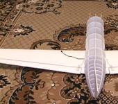 Хвост состоит из 3-х слоев, причем средний слой является частью базового каркаса, вырезанного по профилю из чертежа. Затем после наклеивания обшивки корпуса к килю по бокам были приклеены еще по 1 слою, потом все просто залилось клеем у основания.