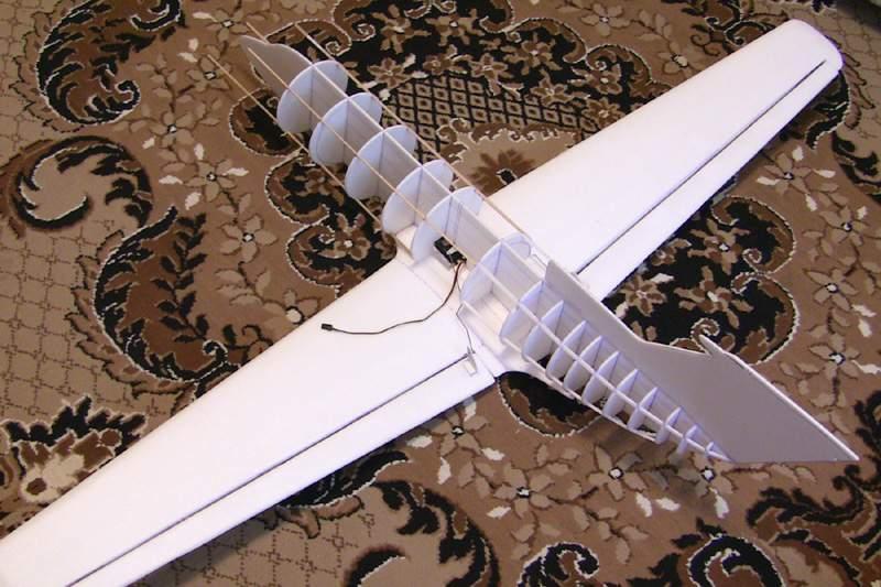 Проделанная работа восхищает, слов нет. Респект! Но вот мотор спереди ну никак не в тему для такого самолета. Может стоило заморочиться с импеллером, даже в ущерб времени полета…