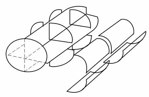 Насчет конструкции - все делалось из потолочного пенопласта - делался крестовой каркас, затем наклеивались поперечные круглые пластины, потом на все это наклеивались элементы обшивки, как правило по 4 штуки - 4 четверти, либо 2 половинки - детали сгибались и потом наклеивались на каркас.