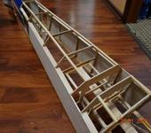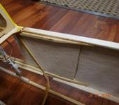 Вот собственно собрал фюзеляж, на фотографиях есть искажение, на самом деле всё ровно. Есть подтёки, эпоксидка текла, не мог исправить так как самолёт лежал так что не мог туда подлезть… Переднюю часть приклеил в стык к хвостовой и наклеил планочку для укрепления. по углам как швы наклеил рейки сосновые, для дополнительной жесткости и наискось склеил стрингера и по совету наклил еще реечку бальзовую. тоже для дополнительной жесткости. Осталось сделать под трубу и обтягивать буду. А, ну и под стойки планку.