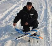 Всем привет!!! Ну вот и облетал я свою цессну. Приехал на поле, подключил питание, укрепил крыло, посмотрел центровку, показалась немного задняя, добавил небольшой груз в носовую часть. Ставлю на взлетку, даю газ, но что то звук мотора какой то странный, и нет тяги. Проверил все, оказалось пропеллер поставил задом наперед. Ладно проблема устранена, дубль-2. ставим на взлетку даю газ, а самолет не едет вперед, оказалось снег на улице был немного рыхлым и колеса самолета проваливаясь в снег тормозили. Было принято решение пускать самолет с рук. Взлетел нормально, тяги хоть отбавляй, немного пришлость триммировать элероны и руль высоты. Еще в полете видно центровочка всетаки немного задняя, просто у меня машина стояла далеко, а с собой небыло ничего тяжелого, ну да ладно. Летает самолет просто замечательно, планирует с такой маленькой скоростью, что мне кажется его можно догнать. летает в 1\4 газа (естественно без набора высоты), короче крутой самолет получился. Да посадка получилась не штатная. Начал я его заводить на посадку, смотрю пролетает мимо, ну и захожу на второй круг, начал разворачивать на себя и тут подул легкий ветерок, ну и его штопорнуло, хорошо что скорость и высота были не большими, короче упал самолет с высоты примерно 3 метра, Согнуло только переднюю стойку, самолет целый, единственно пришлось за ним бежать метров 100. Вообщем смотрите фото и видео облета