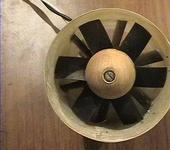Из того что осталось от стакана снятого с бутылки вырезаются лопатки устройства выравнивания потока. Резать нужно паралельно оси, ширина лопаток 25мм, длина 18,5мм. Они (6 штук) приклеиваются к мотораме сначала на циакрине, а потом на смоле. В мотораму вклеивается на ЦА диск из 3мм фанеры для крепления двигателя. А потом всё это хозяйство помещается в канал. Вот что получилось: