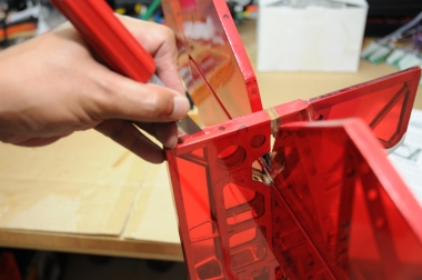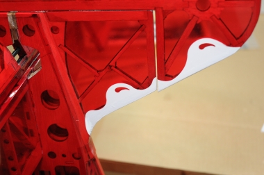 –Заклейка щели руля направления делается по той же методе, что щели руля высоты и элеронов. Единственная маленькая разница: подрезать ленту в точке перехода фюзеляж/киль, чтобы легла ровно.