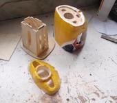 - Вырезал из сухой еловой доски вот такую загогулину и привернул к ней стойку с новыми колесами: