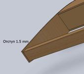 Первый профиль кромки создается на внутренней плоскости концевой нервюры, по верхней и нижней грани следует сделать отступ 1,5 мм для учета обшивки, второй профиль получаем линией пересечения грани первой созданной детали с плоскостью корневой нервюры, для этого необходимо вернуть деталь в состояние когда была отсечена часть в месте установки элерона, достаточно просто погасить элементы детали. На рисунке линия пересечения отображена оранжевым цветом и является частью второго эскиза. Строим кромку командой тело по сечениям, результат должен быть такой