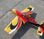 Полный вес самолета получился - 2510 гр. с винтом 16 х 8 XR Type A Beechwood Sport Propeller тяга составила 4780 гр. двойного запаса по тяге не получилось, но коэффициент 1,90 на свежем аккумуляторе тоже весьма не кисло. Облет самолета показал, что за 8 минут полетного времени съедается не больше двух третей емкости аккумулятора и все силовое оборудование сразу после посадки чуть теплые на ощупь (правда, было весьма прохладно), становится совершенно не понятно, чего ругался Мотокальк и пророчил температуры мотора под 160С и расплавление клея магнитов. К моменту написания этих строк самолет выполнил 10 вылетов, все полеты проходили в ветреную и дождливую погоду, поэтому полноценно ощутить самолет не получилось. Можно с полной уверенностью говорить что самолет очень шустрый, действительно 3D класса, с довольно большим потенциалом, в управлении послушный и предсказуемый, но за счет того что очень верткий надо быть внимательным с отклонением стиков, чувствует малейшее отклонение или невозврат ручек в ноль. Летает как по рельсам даже с сильным боковым ветром, на посадке вполне предсказуемый, планирует тоже очень хорошо, на лифте держится почти без раскачки.